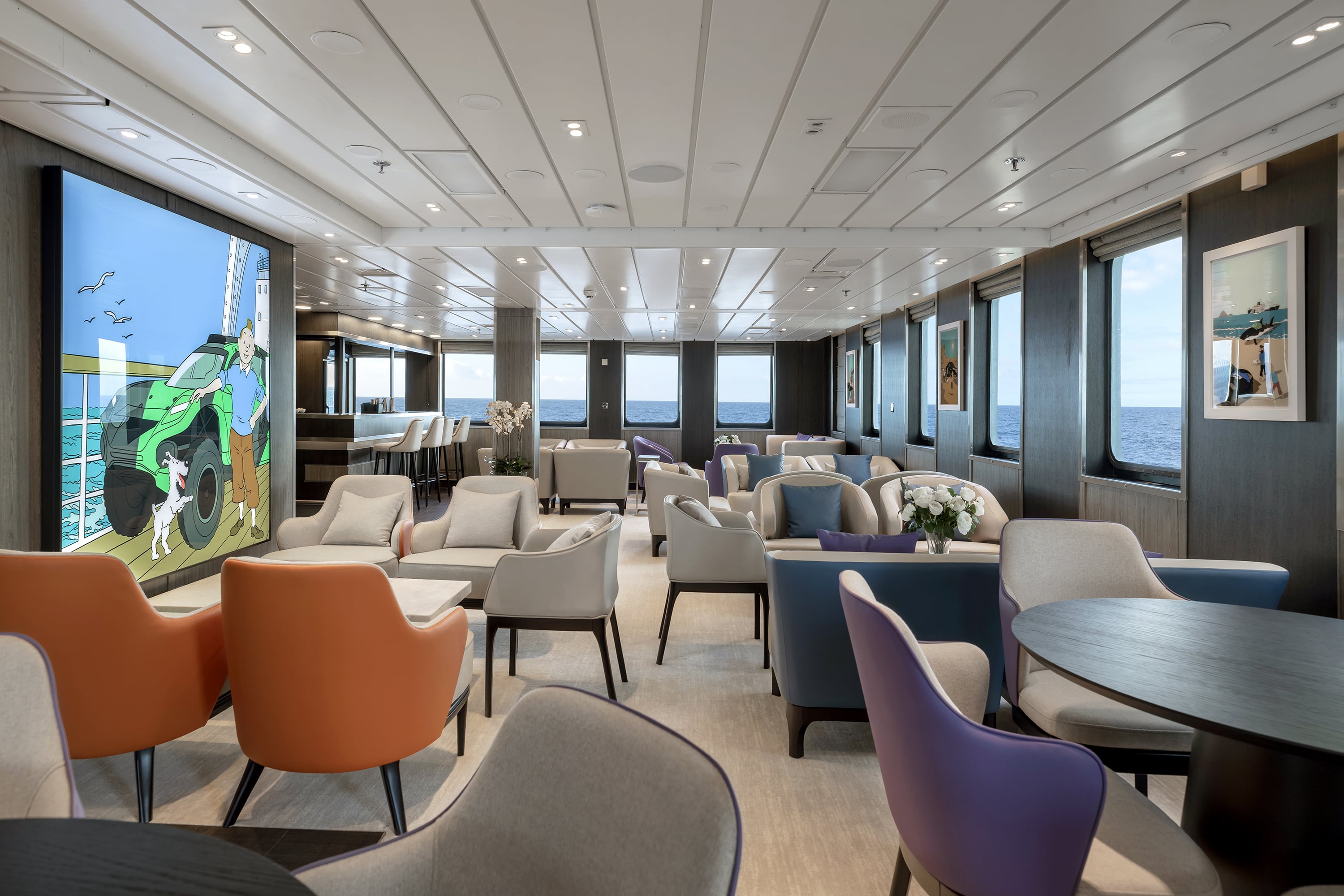 She can accommodate 215 pax; is geared with a combined deck and cargo space for 108 TEU.