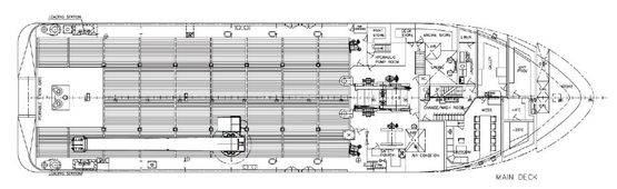 Large deck with crane reach to stern roller and wood protection for safe and efficient load-out, sea fastening