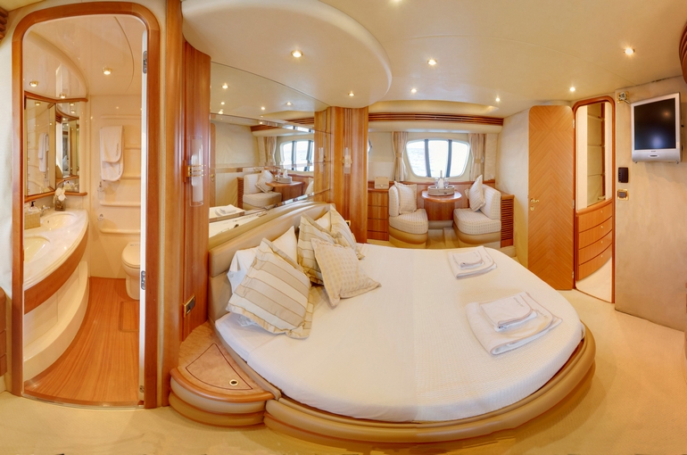 In addition to these, she has also teak decks all over (aftdeck, fore deck, fly bridge, walk around), more modern interiror due to her mat woods, only cream/beige fabrics & leathers all over her exterior & interior (all upholsteries replaced March 2019) and new wooden floor in salon, enhancing style and luxury. Attention is paid to every detail on board, with designer's new GUY LAROCHE bed linen & towels, new comfortable mattresses in all cabins, expensive porcelain tableware, quality amenities sets etc.