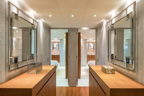 The yacht features a full-beam master suite on the main deck. The Owner’s suite offers a study and a seating area, the main bedroom, a dressing room and en-suite bathroom with a wellness spa.