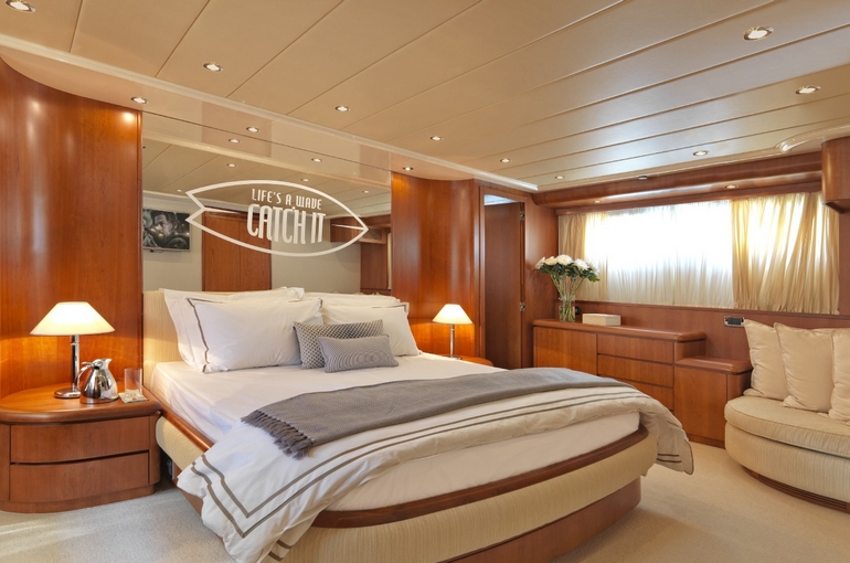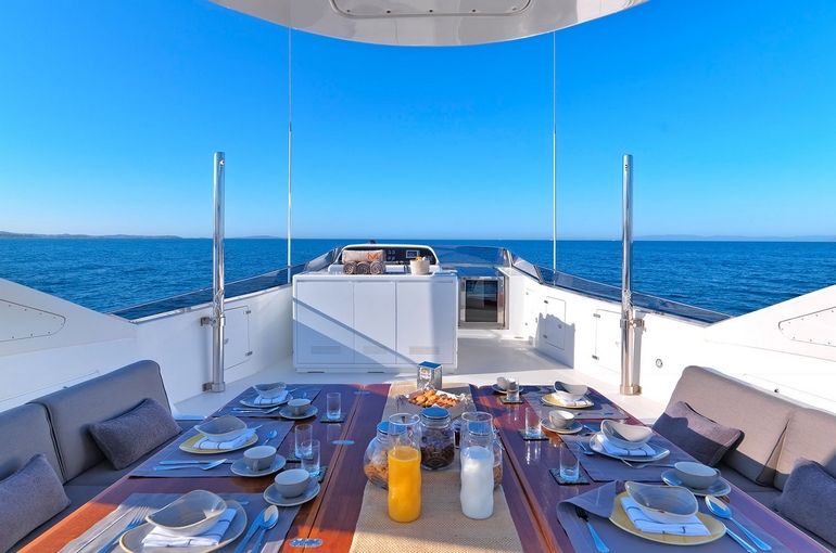 She can accommodate up to 12 guests in her spacious 5 cabins, including 1 Master Suite, 2 VIP cabins and 2 twin cabins with pullman beds. Falcon 100' MARTINA charter experience is enhanced by a vast variety of water toys to enjoy! Also, she offers spacious exterior decks that ensure privacy and luxury under the sun.