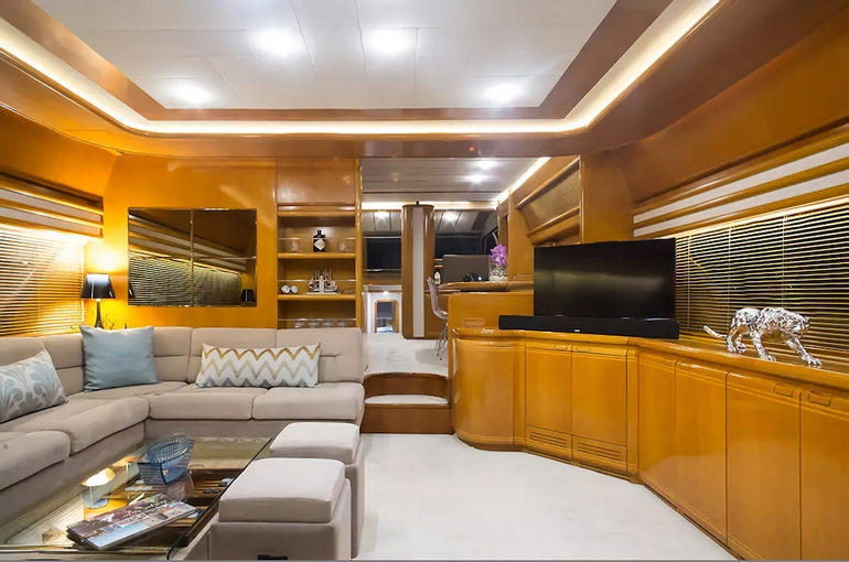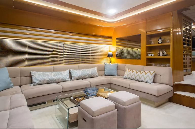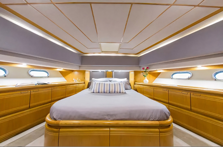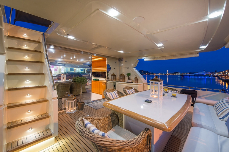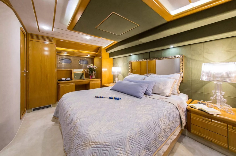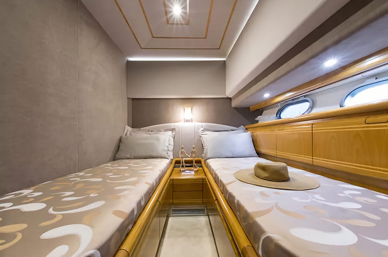 She can accommodate up to 8 guests in 4 en-suite staterooms, including a spacious Master cabin, one VIP cabin and 2 twin cabins, all with en-suite facilities. She combines speed, superb stability and optimal guest comfort in order to provide the highest standards to demanding guests. The yacht also has a nice salon with a dining area and a large dining table on the stern. Modern interior design and outstanding performance offering an ultimate charter experience in the Greek islands. The flybridge has a big sunbathing area for relaxation and enjoyment. 4 crew members will make sure that guests' vacation is nice and memorable.