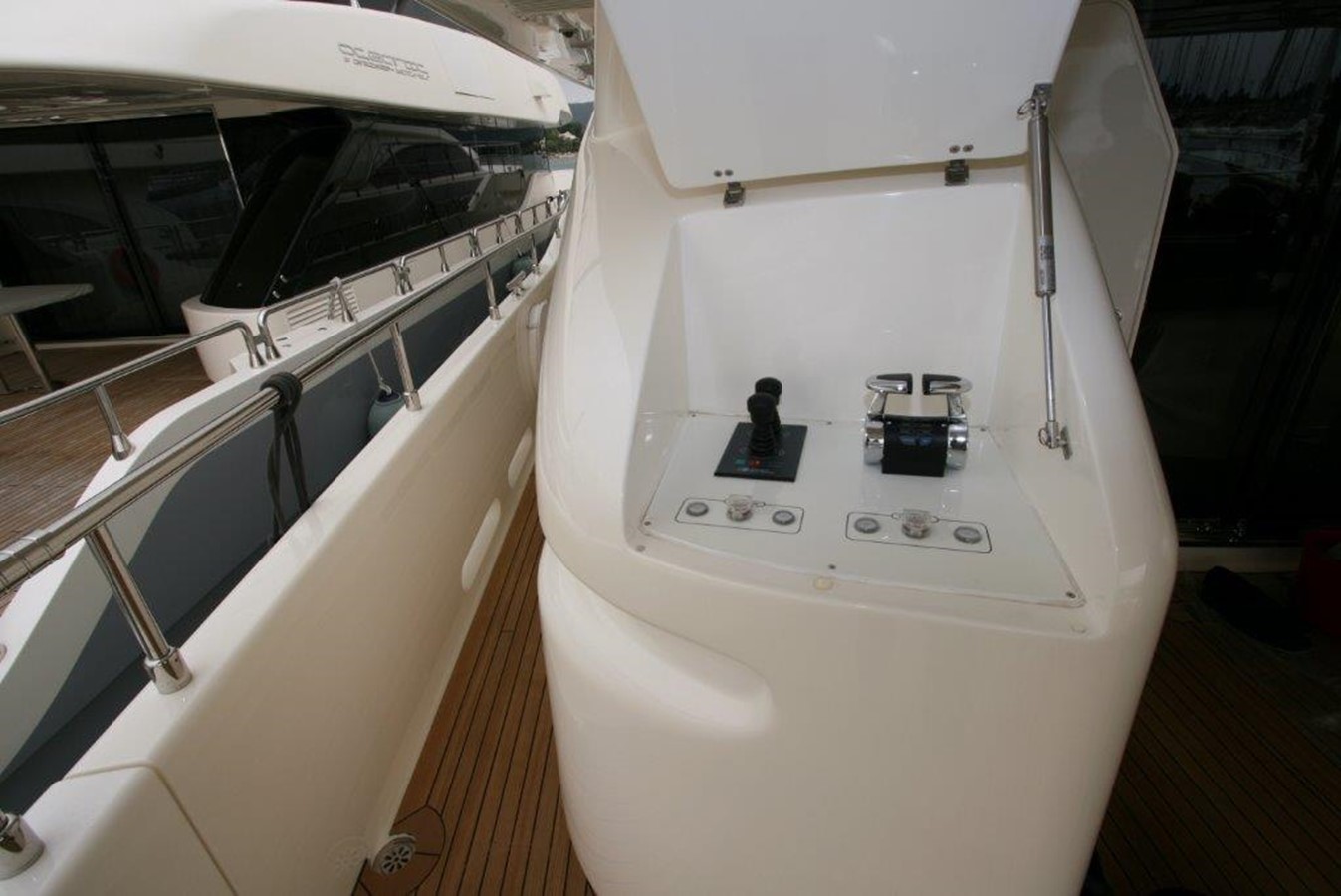 Main engines hydraulic controls with throttle and gear levers on port, starboard, aft deck Synoptic panel unit with acoustic and visual alarms for portholes and weather tight doors and bilge pumps and smoke detectors and for generators and shore power management as well as for GPS