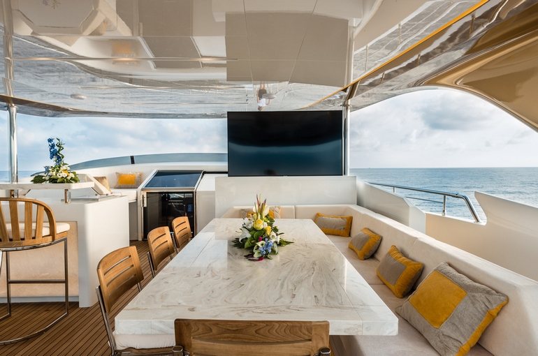 Vhf, Autopilot, Generator, Cushions, Eco, Stabilizer , Air conditioning, Gps, Outboard, Hydraulic footbridge, Refrigerator, Deck jacuzzi