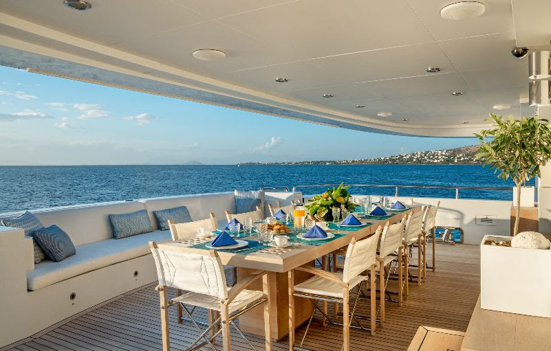 9. Expansive sundeck with a large Jacuzzi, elegant lounge area, fully equipped bar, al fresco dining, sunbathing area and Flybridge TV for ultimate relaxation