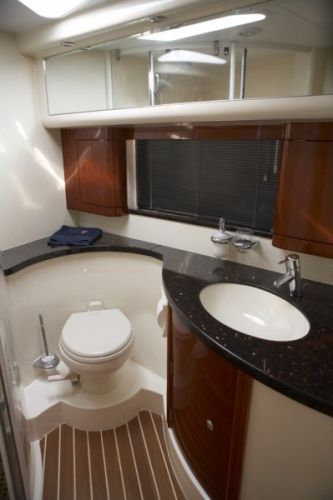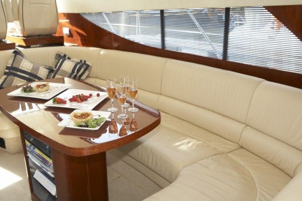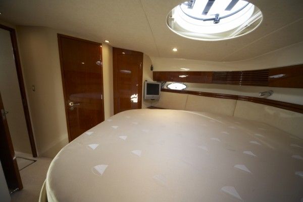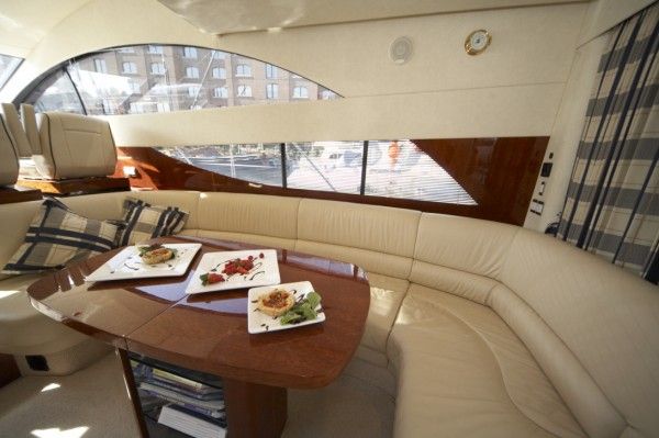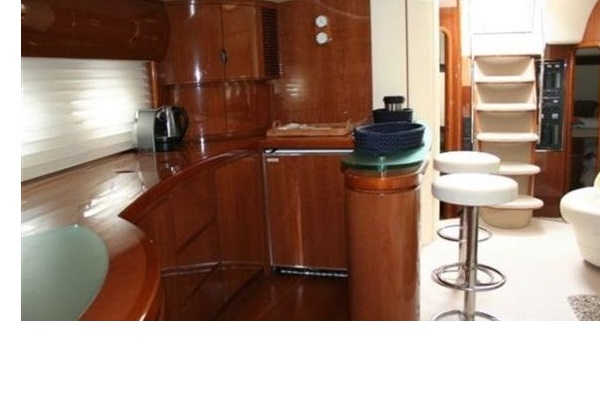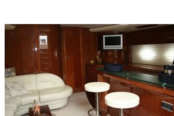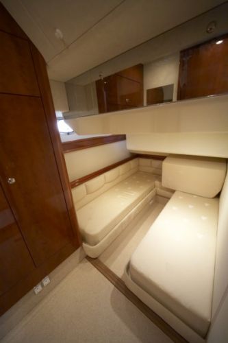 3 cabins plus a single crew cabin (4 bath / shower). High glossy Cherry wooden interior and beige leather upholstery in salon.
