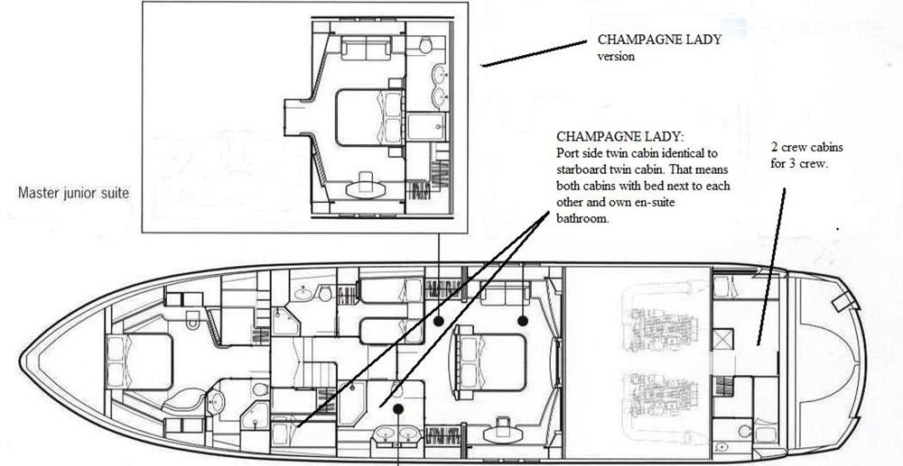 4 cabins layout. Master suite and VIP cabin with en-suite bathroom and the 2 twin cabins with en-suite bathrooms. 2 crew cabins aft with one single and one double bed and one bathroom.